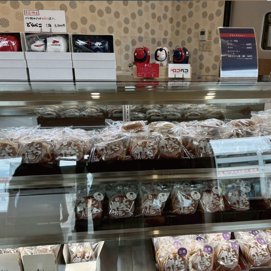 猪苗代店は、創業時から使い続けている「どらや製菓」の看板が今も変わらずお客様をお迎えしております。猪苗代店では、「しっとり系」どら焼を扱っております。